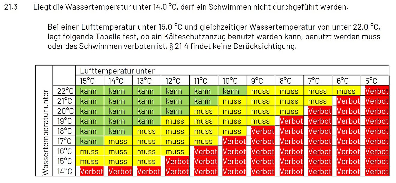 Kälteschutz ja, oder nein? Das ist eine Frage, zu deren Beantwortung die Sportordnung Auskunft gibt. Die Sportordnung steht hier. [Die Lektüre der SpO ist grundsätzlich empfehlenswert, denn jeder Triathleten sollte wissen, wie sein Sport “geregelt” ist!] Der Einsatzleiter misst eine Stunde vor Start Temperaturen von Luft und Wasser und entscheidet: Triathlon, oder Duathlon, falls Triathlon mit oder ohne Kälteschutz usw. Beim Löwentriathlon, dem Frühjahrsklassiker im frischen Westerwald trugen in den vergangenen Jahren die meisten der Teilnehmer Kälteschutzanzüge ("Neos"). Duathlon gab es lediglich zweimal (zuletzt 2025), und zwar wegen zu niedriger Luft- und Wassertemperatur.