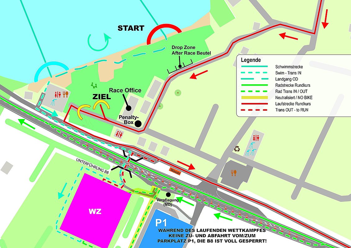 Auf dem Gelände, direkt vis a vis zum Parkplatz (P1) gibt es zwei Wechselzonen (WZ1 und WZ2). Deren Belegung ist von den Formaten abhängig. Konkret bedeutet dies: Am Samstag sind SPRINTER der offenen Klasse (AK) in WZ2. Sonntag belegen die MDler die WZ2 und die WZ1 ist den ODlern vorbehalten. Nach dem Schwimmausstieg geht es rechts, dann links und dann geradeaus, rechts unter die Unterführung hindurch direkt in eine der Wechselzonen (siehe oben). In dem Bereichen vor den Wechselzonen werden auch die Startunterlagen ausgegeben sowie am Sonntag, die Tageslizenzen (OD und MD) verkauft.