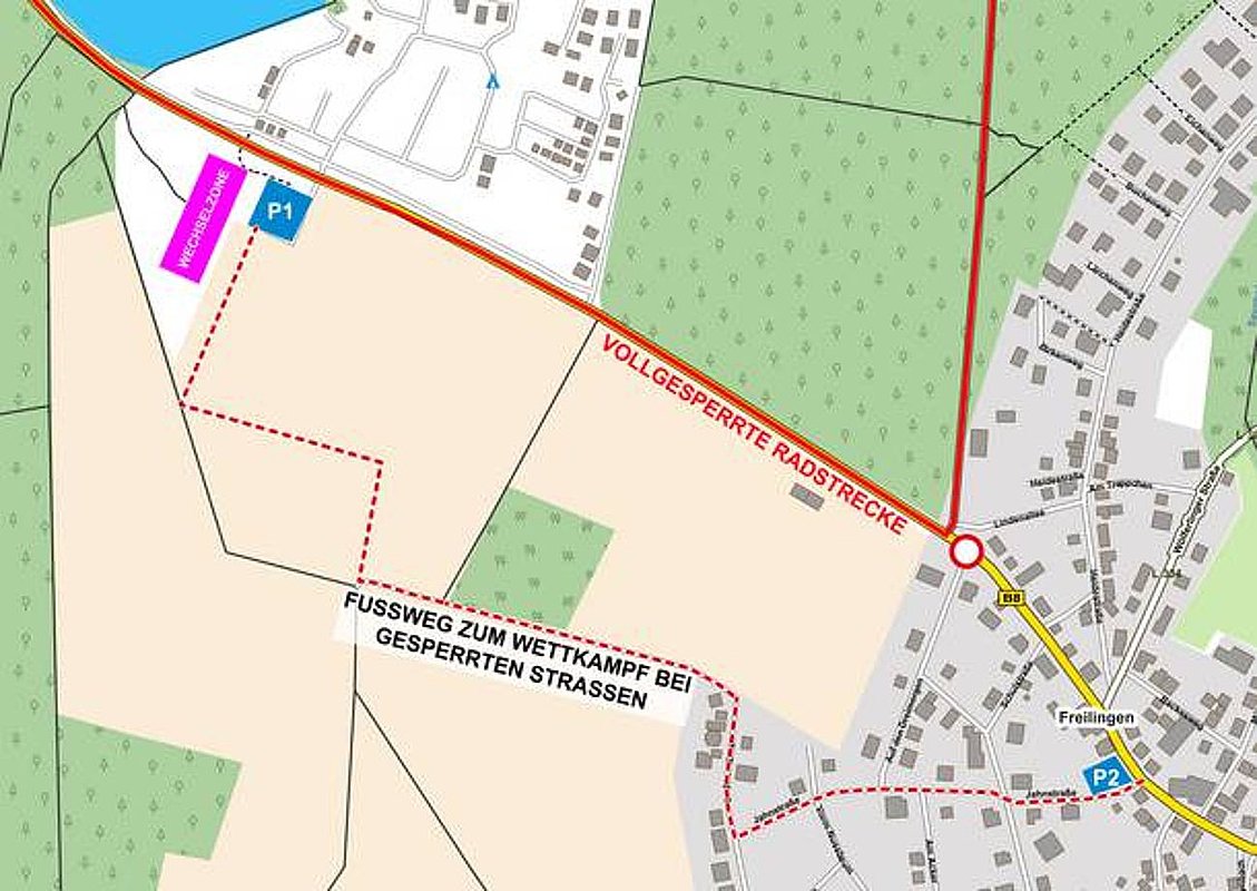 Wer am Wettkampftag zeitkritisch anreist, oder bereits vor Radstreckenfreigabe (Aufhebung der Straßensperrungen) wieder wegfahren muss, benutzt am besten den öffentlichen Parkplatz in der "Jahnstraße" im Ort Freilingen. Von dort aus geht es die Jahnstraße hinauf, dann rechts ab in die Straße "In den Hähnen", dann weiter links hinauf über einen geteerten Weg bis zum Parkplatz des Strandbades. Aber Vorsicht, die letzten 140 Meter sind Wiesenweg, die zwar gut zu gehen, aber nicht gut mit dem Rad befahrbar sind.