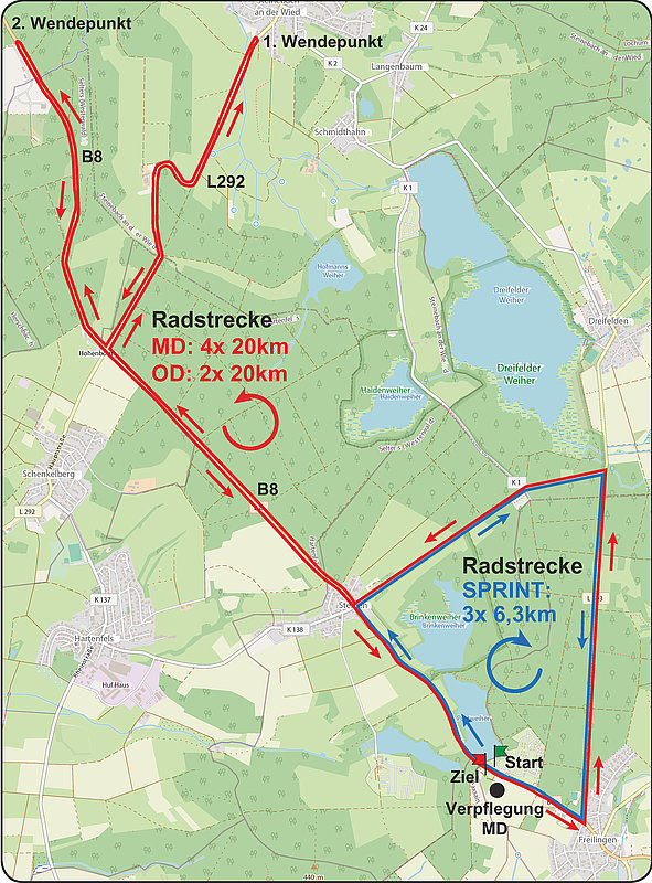 SPRINT: Bei der Radstrecke für die Disziplin SPRINT handelt es sich um einen wendepunktfreien Rundkurs, ideal für Anfänger. Der Start befindet sich in unmittelbarer Nähe zur Wechselzone an der B8, der historischen "Hohen Straße". Von dort aus geht im Uhrzeigersinn es zunächst mit leichter Steigung hinauf Richtung Steinen und von dort rechts (90 Grad-Kurve) ab Richtung Hachenburg und Dreifelden auf die K138 und nachfolgend leicht bergab auf die K1, die in die L303 mündet. Nach dem Rechtseinschwung (90 Grad) auf die L303 geht es dann zunächst leicht bergauf und dann relativ flach und dann abschüssig weiter auf der L303 bis wieder die B8 am Ortseingang Freilingen erreicht ist. Nach der nächsten Rechtskurve geht es auf der B8 den kleinen Anstieg hinauf Richtung Strandbad auf die nächste Runde bzw. bis zum Ziel. Insgesamt werden drei Runden (SPRINT=19,5Km) gefahren. Insgesamt handelt es sich um eine übersichtliche und "einfache" Radstrecke, die schnell gefahren werden kann. Allerdings sollte das wellige Profil nicht unterschätzt werden. Die Gesamtanstieg pro Runde beträgt rund 50 Höhenmeter.