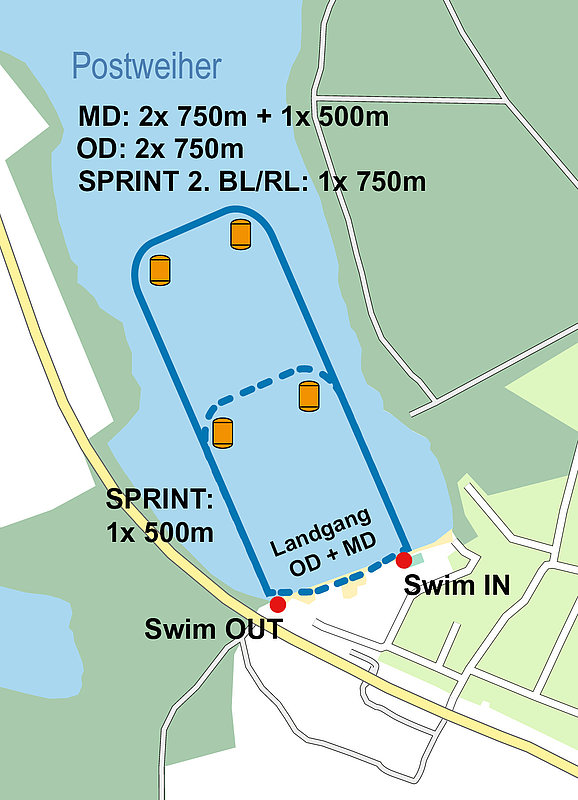Der Schwimmeinstieg befindet sich am Nordostufer des Postweihers. Es wird bei allen Distanzen gegen den Uhrzeigersinn geschwommen. Gestartet wird nach der Aktivierung der Transponder von Land aus und zwar in einer Startgruppe pro Wettkampfformat (Massenstart).